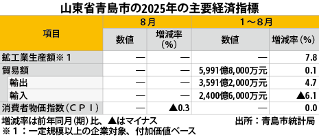 中国山東青島の1~8月経済統計、鉱工業は7.8%増経済マクロ経済貿易統計山東省青島市統計局が発表した同市の2025年1~8月の鉱工業生産額(一定規模以上の企業対象、付加価値ベース)は、前年同期比で7.8%増となった。伸び率は1~7…