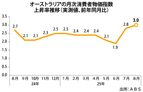 オーストラリア豪8月CPI上昇率、3%に加速経済マクロ経済統計豪政府統計局(ABS)が24日に発表した8月の消費者物価指数(CPI、実測値)は、前年同月比で3%上昇し、前月の2.8%上昇から加速した。12カ月ぶりの高水準…