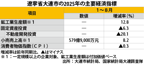 中国遼寧大連の1~8月経済統計、鉱工業は12.8%増経済マクロ経済統計遼寧省大連市統計局、国家統計局大連調査隊が発表した大連市の2025年1~8月の鉱工業生産額(一定規模以上の企業対象、付加価値ベース)は、前年同期比で12.8%…