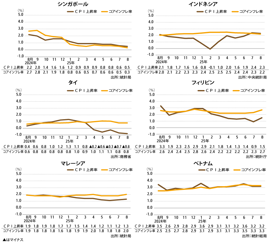 ASEAN【グラフでみるASEAN】消費者物価指数(8月)2カ国で上昇率が鈍化経済マクロ経済東南アジア諸国連合(ASEAN)の2025年8月の消費者物価指数(CPI)は、主要6カ国のうち2カ国で上昇率が前月から鈍化し、1カ国で下落幅が拡大した シ…
