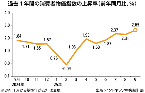 インドネシア9月CPIは2.65%上昇、食材が押し上げ経済マクロ経済統計NEW インドネシア中央統計局が1日に発表した9月の消費者物価指数(CPI、2022年=100)は108.74となり、前年同月比2.65%上昇した。上昇率は、前月に続き食材…